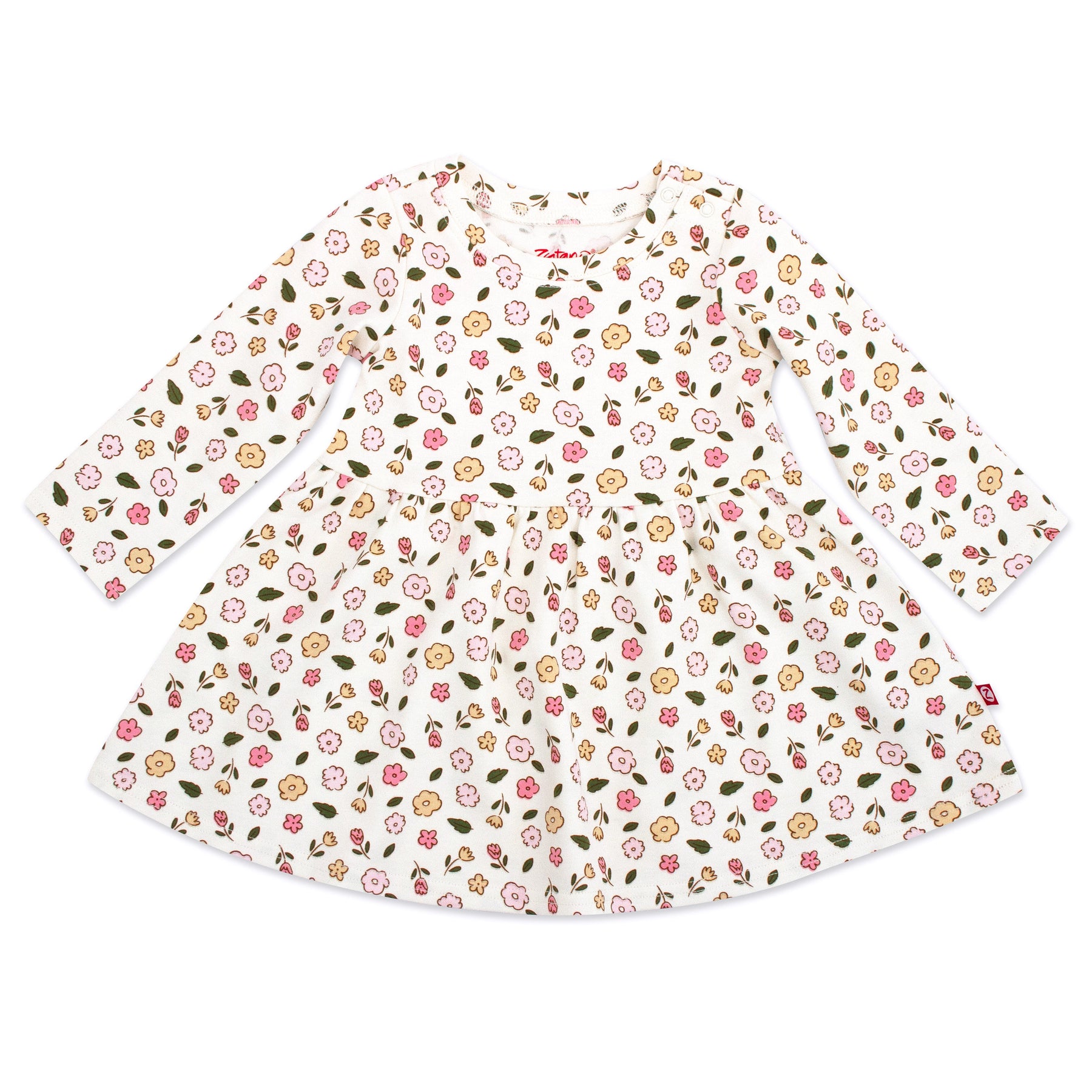 A long sleeve white organic cotton interlock dress for babies, with a floral print design consisting of yellow and pink flowers and green leaves.