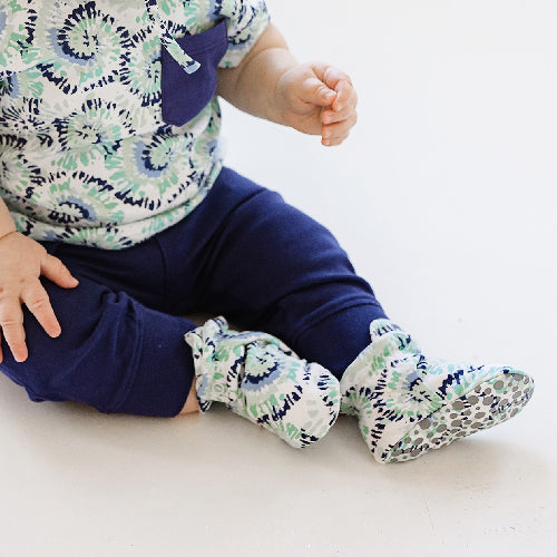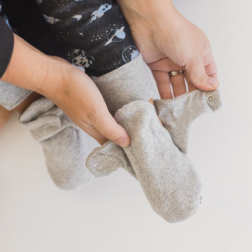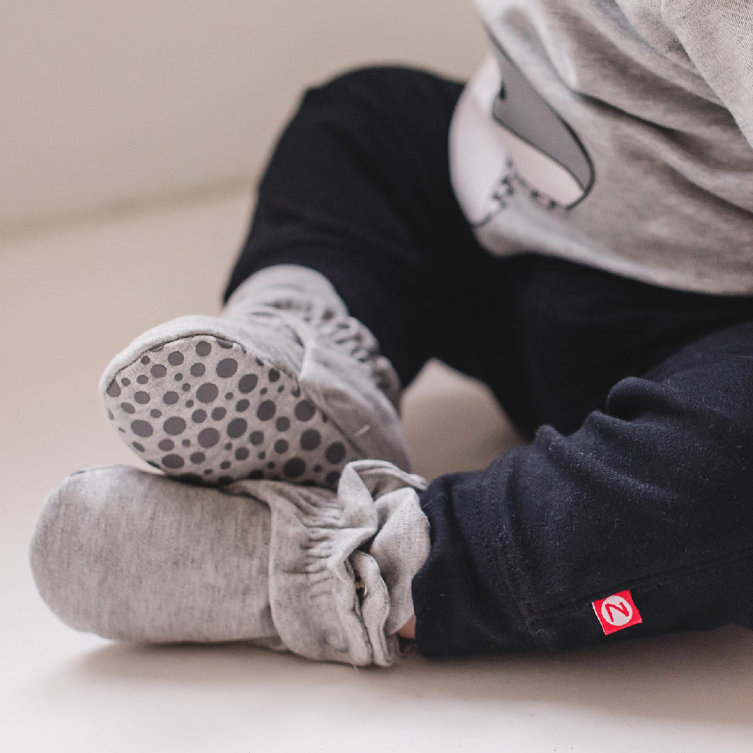 Our Organic Cotton Gripper Booties offer GOTS certified 100% organic cotton interlock inside and out for extra comfort and softness at a lighter weight. Our signature two-snap secure fit helps them stay on even the most wiggly feet, putting an end to lost baby socks. Rubber grippers on the bottom help new walkers grip slippery floors when they start to take those momentous first steps. Available in a range of coordinating colors and prints that mix and match with other Zutano items. Featured here in khaki.