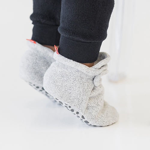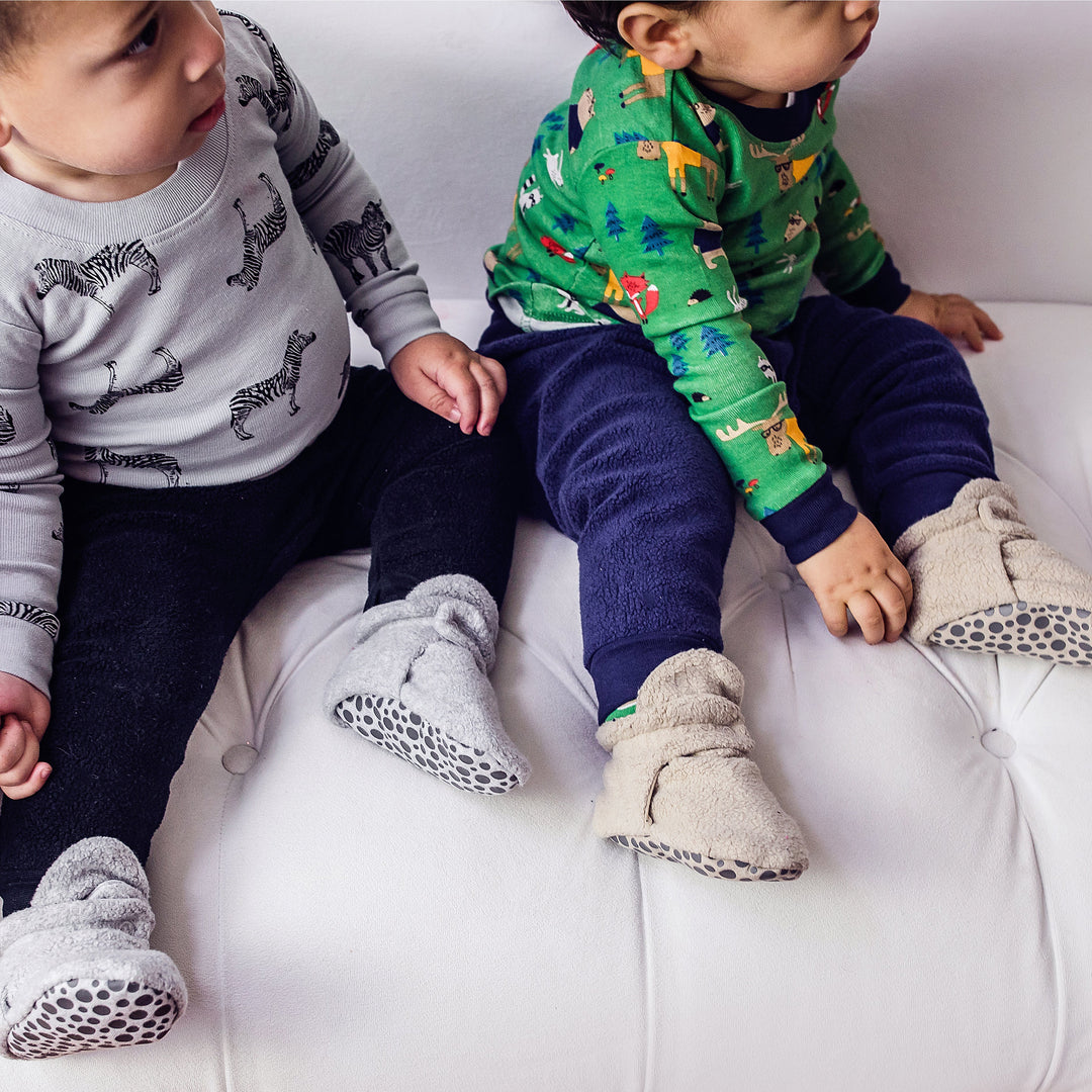 Our best-selling cozie fleece booties feature our signature two-snap secure fit and an ultra soft fleece exterior with an organic cotton lining to wrap your baby's feet in comfort. The two adjustable snaps help the booties stay on while allowing them to shape well to the contours of your baby's foot. Designed for durability, these booties maintain their shape and feel after extended wash and wear. Featured here in cream.